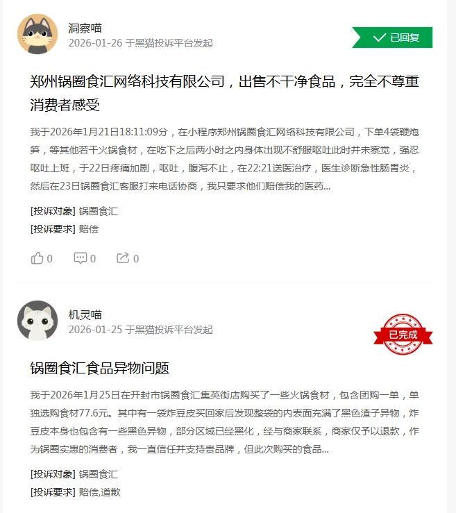 据报道,2025年11月,白山一名消费者爆料其正在锅圈食汇采办的毛肚中发觉一只苍蝇;同年10月,有网友正在“七珍菌菇荟”产物中发觉;9月有消费者赞扬,锅圈食汇的暖锅底猜中呈现蛆虫,监管部分介入协调。