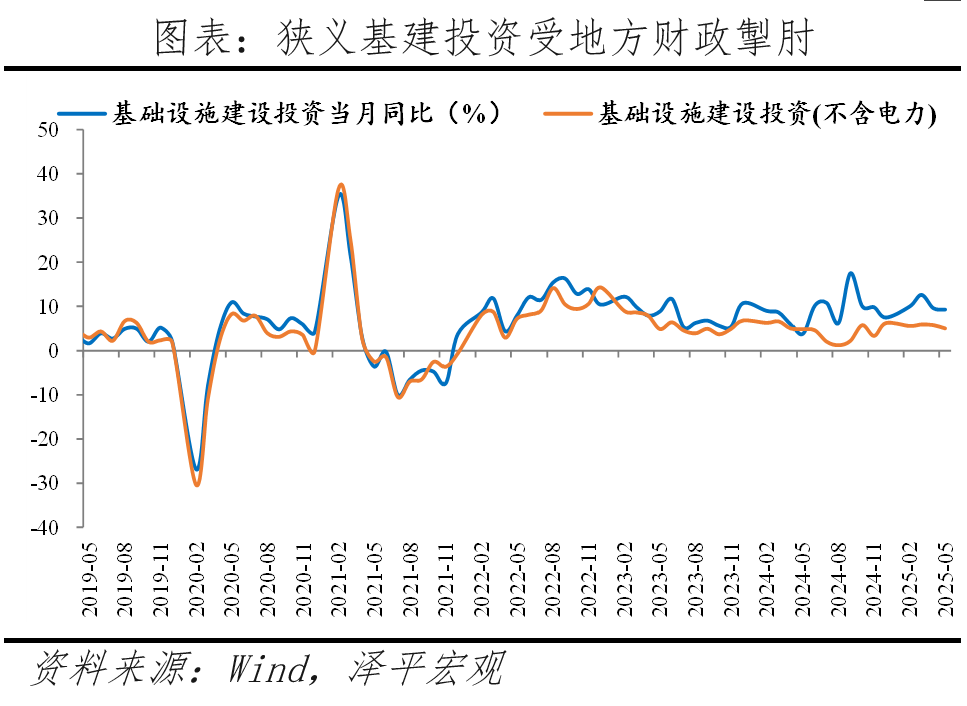 四是即便现债化解持续推进,处所财务压力仍大,掣肘基建投资,广义基建和狭义基建增速展示较大差距。5月广义基建和狭义基建(不含电力)同比别离增加9。3%和5。1%,别离较4月下降0。3和0。7个百分点。