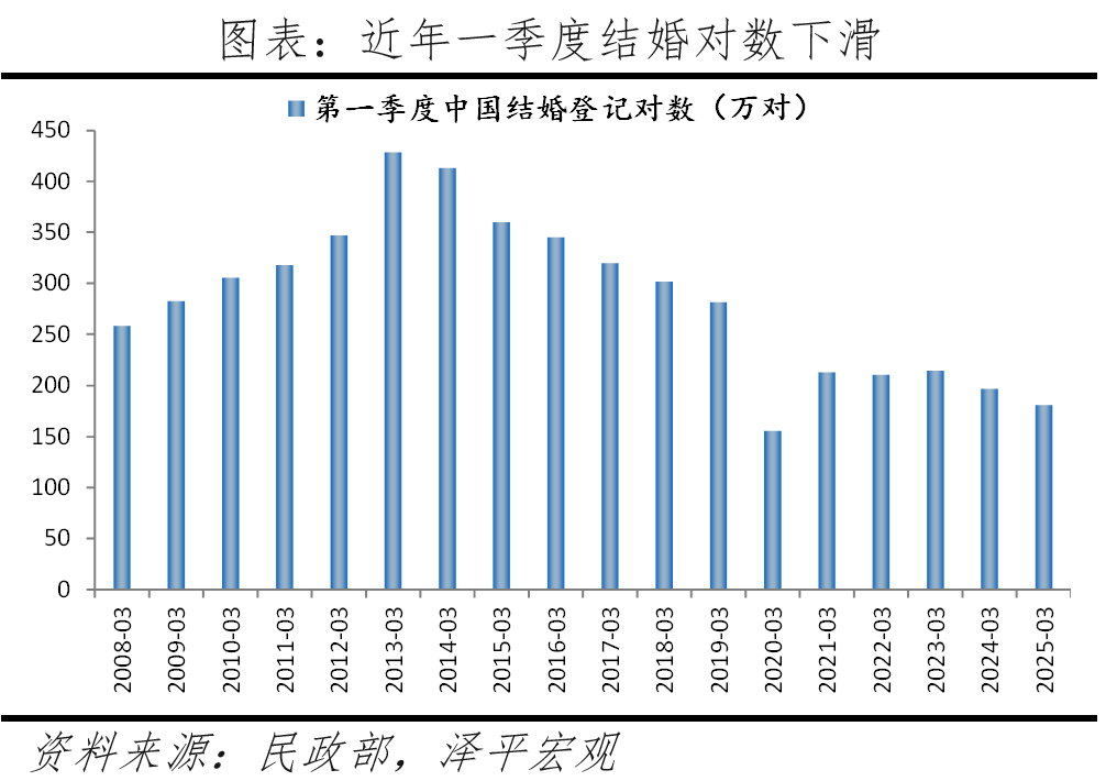 3)不婚化加剧。因为“无春年”、年轻生齿削减、成婚成本过高、婚姻不雅念改变等,2024年全国成婚登记610。6万对,较2023年削减157。6万对,降幅为20。5%。2025年第一季度全国成婚登记同比为-8。1%,再创同季新低。